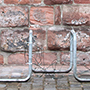 Drei mal zwei Würfel aus Draht, befestigt mit Kabelbindern an einen Fahrradständer, stellen eine Besetzung und Umfunktionierung des Ortes dar.